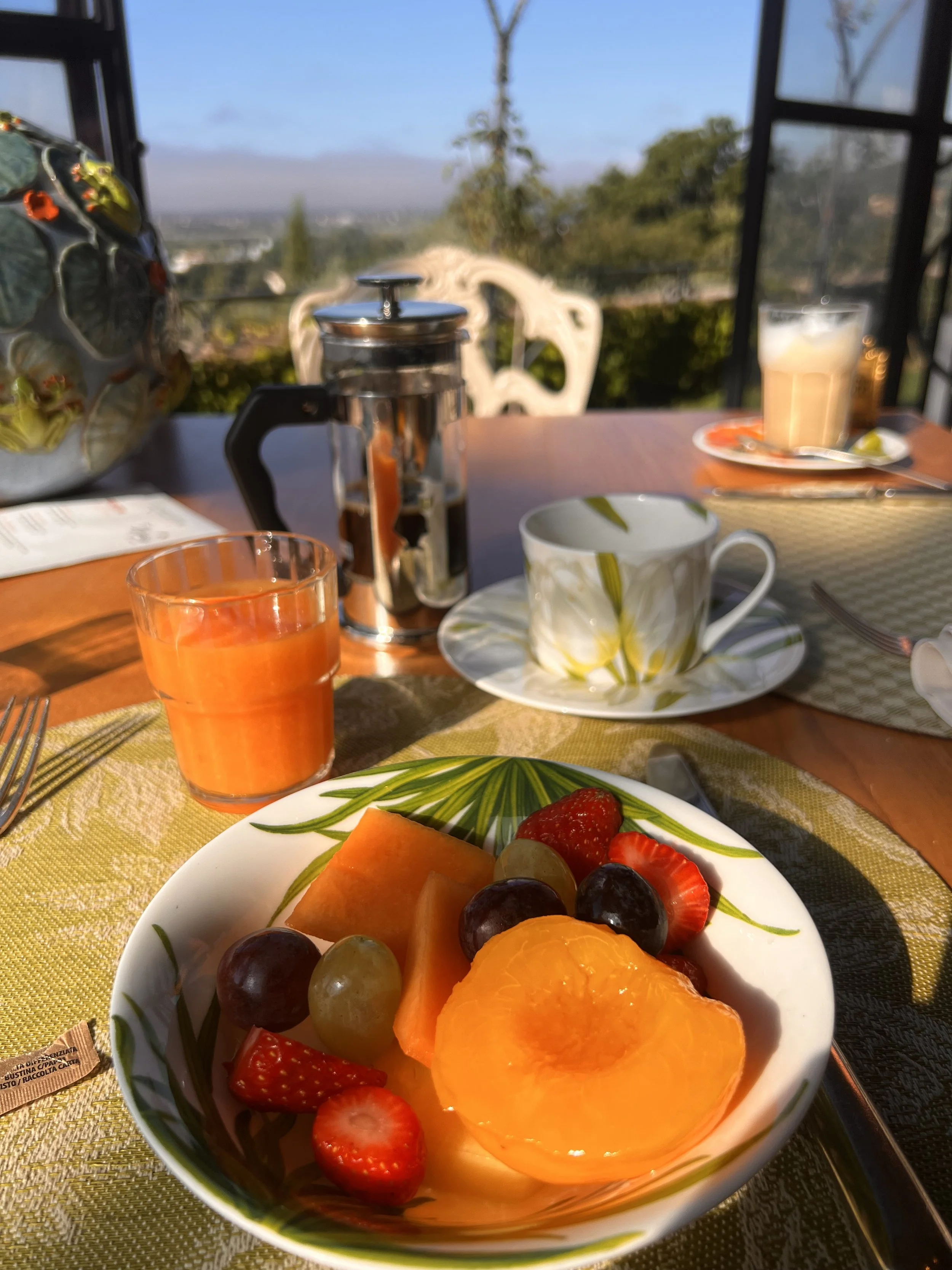 Breakfast is served in the atrium, and no amount of research can prepare you. It is at first visual - the impression of this glass-enclosed Italian paradise looking upon Cortona and the Tuscan valley below. Handmade ceramic orbs, in varying natural patterns born from garden and sea, adorn each delicately-set table. Fine bone china tea cups and saucers in the most resplendent white tulip pattern. But wait…there goes a set in red, and then yellow, and orange. Floral plates stacked of a separate collection from the same brand (which I know now as Taitu Milano, and am wishing wedding china were still a thing). Farm tables displaying an array of pastries, jams and preserves of a seemingly endless variety: fig, clementine, cherry, orange, strawberry, raspberry…I could go on. Scents: espresso, caffe latte, flaky buttery pastries galore. And finally, taste. The fresh juices are the first to pass my lips: a rainbow smorgasbord of glass carafes, including such unexpectedly delicious ingredients like artichoke and fennel. Even the scrambled eggs in the warming trays were a rich golden delight - straight from the property’s “Eggscelsior Hotel” chicken coop, the complete opposite of your standard liquid-y reconstituted powder. There are cheeses behind glass…and not homogenous slices of a nondescript nature. We’re talking bufalo mozzarella. Varietals of the region’s reigning Pecorino. And bleu (which I don’t actually like but nobody’s perfect). Audibly, I can’t recall any music playing but honestly I probably blacked out from happiness at this point.